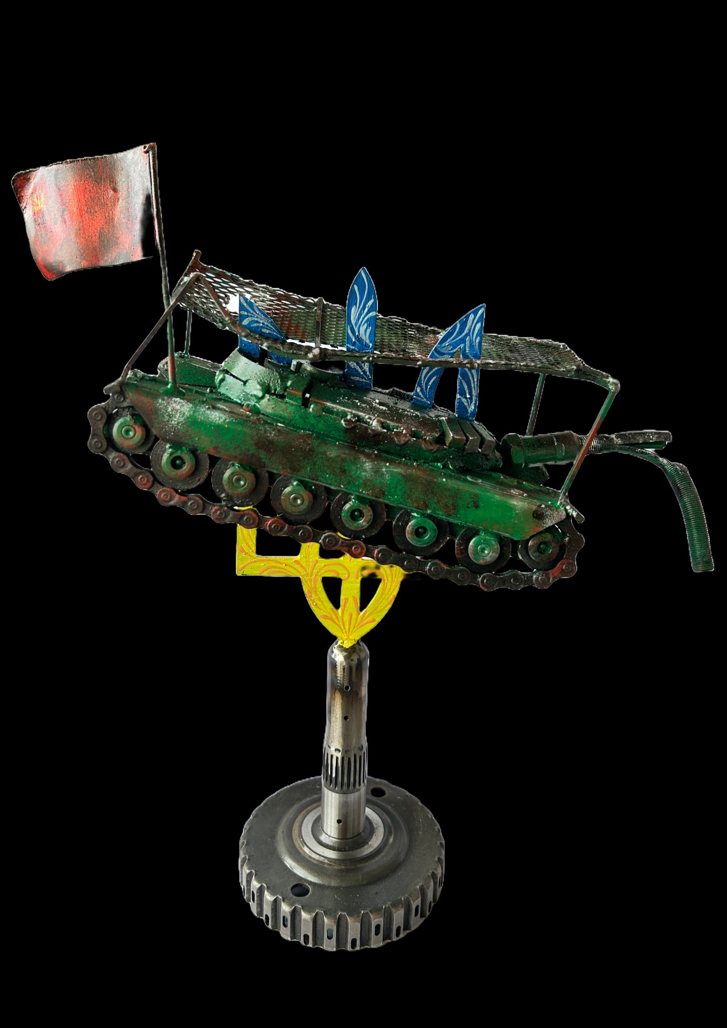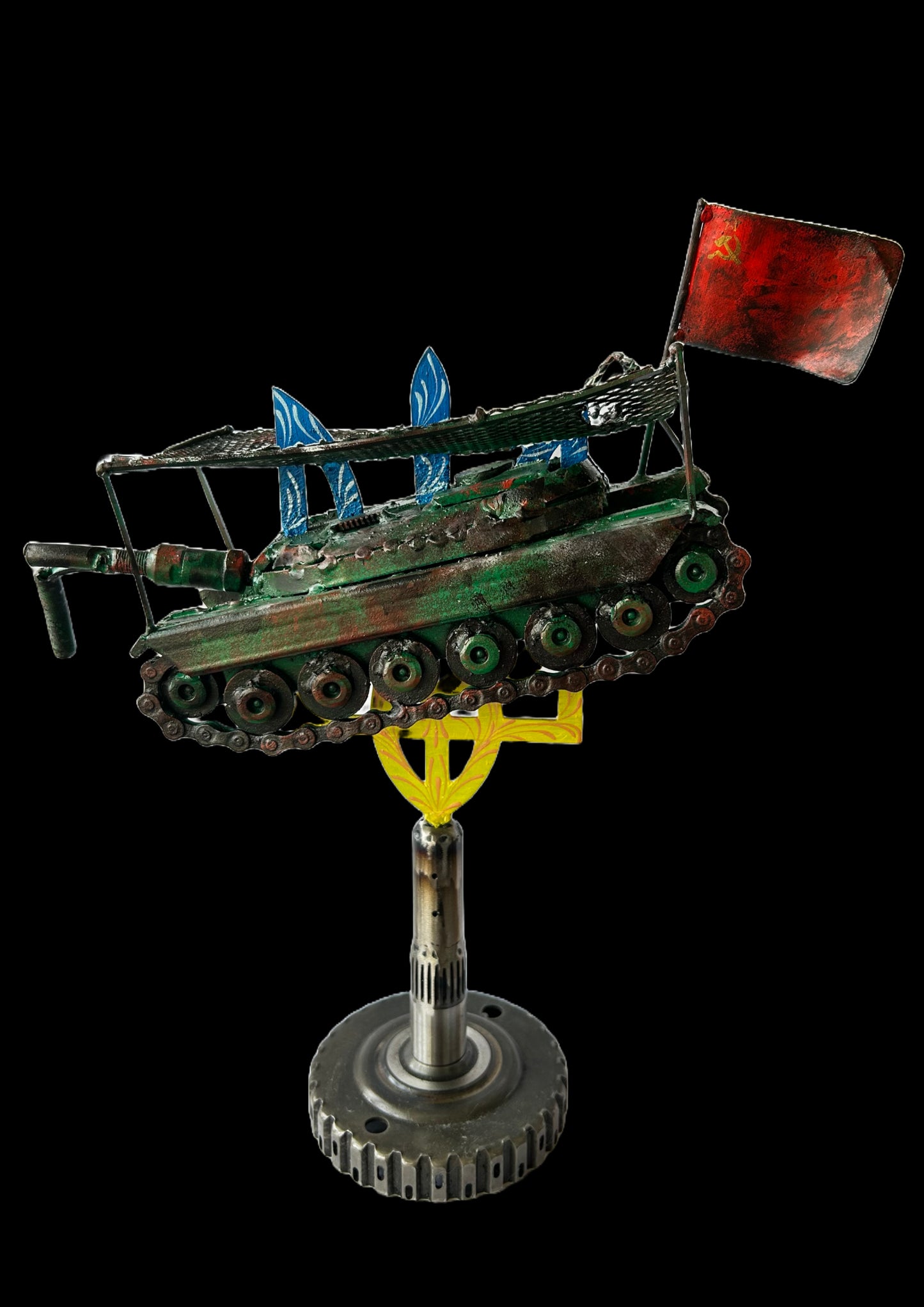 Zerstörter russischer Panzer mit sowjetischer Flagge, auf Tryzub aufgespießt. (39x34cm)