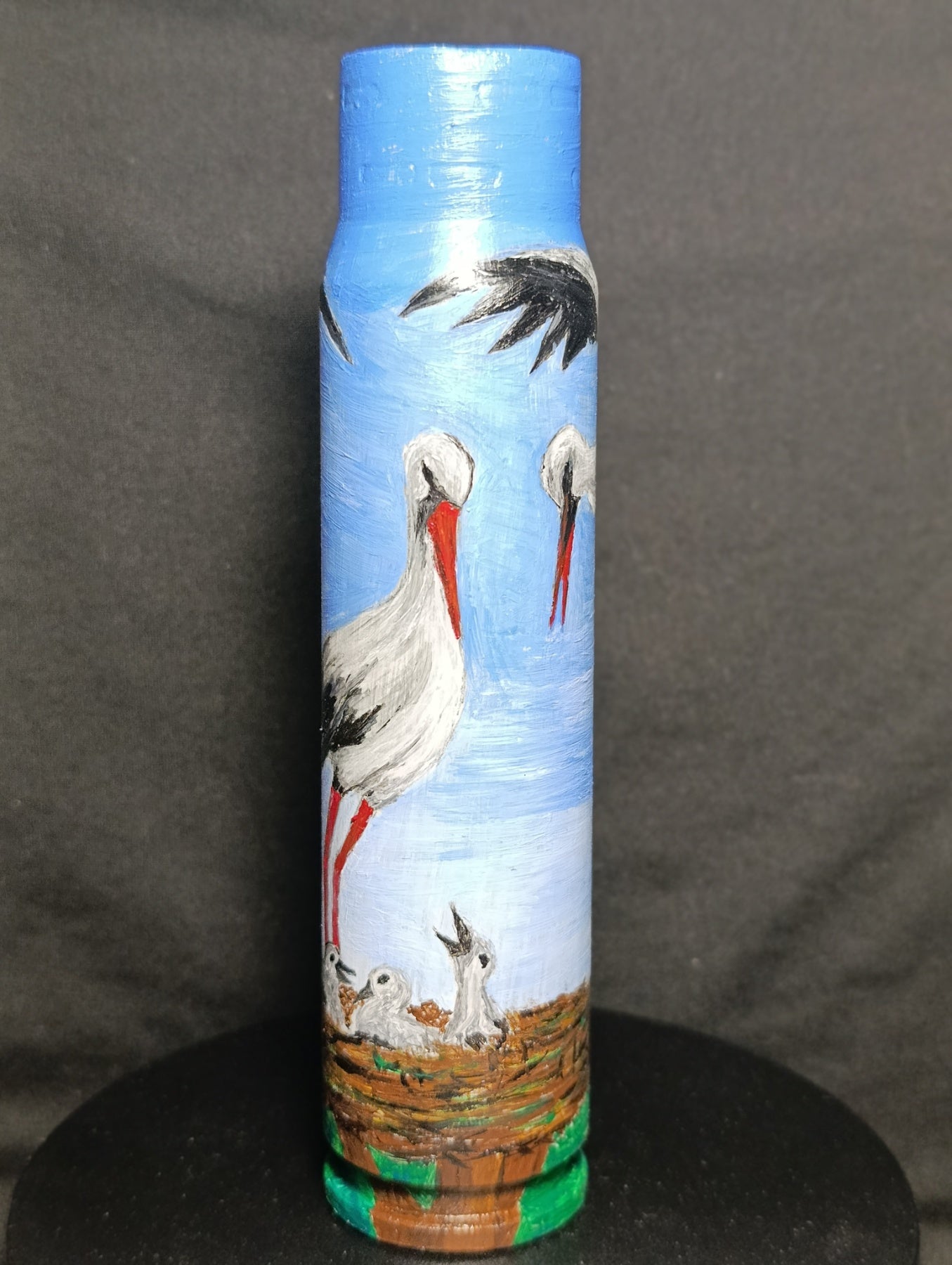 Storch-Familie. Bemalt auf einer 30mm Shell von Julia Seminoh, der Mutter, deren Garten vom Ork-Panzer besetzt wurde. Shell ist 16,5 cm hoch.