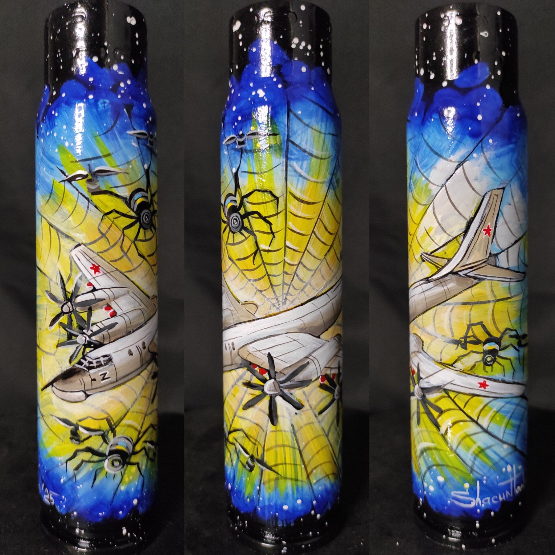 TU-95 ruso atrapado en una telaraña ucraniana. Pintado en un proyectil de 30 mm. (16,5 cm de alto) por Tanya Shacun.