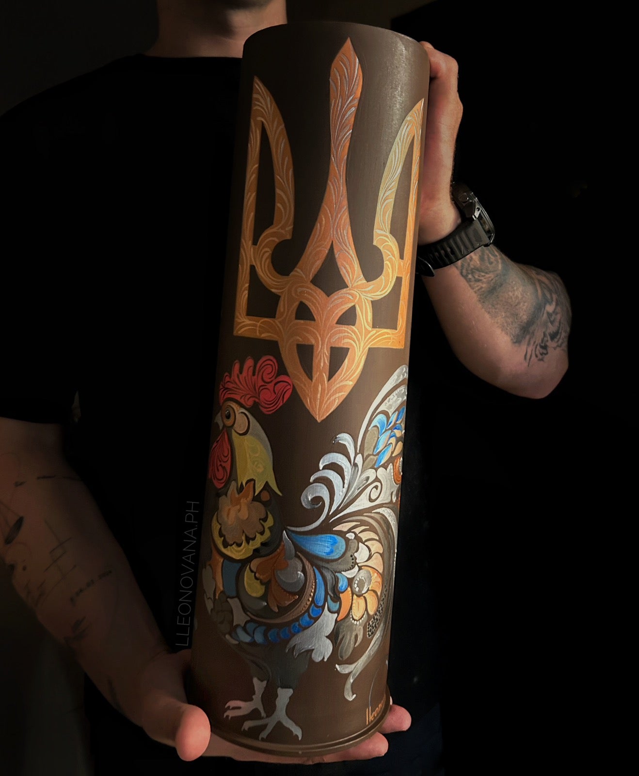 122mm tube (44.5 x 12.2cm) painted by Ukrainian artist Anastasia. You can follow her on instagram.com/lleonovana.ph/