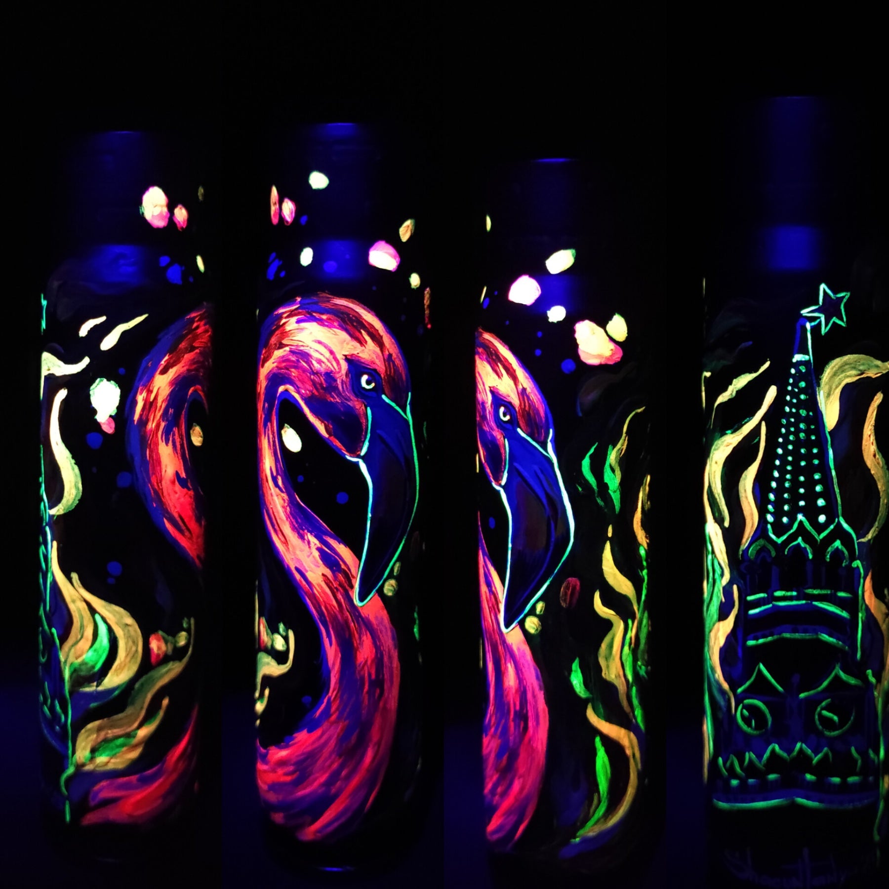 Artwork is covered in fluorescent colors visible in the dark.