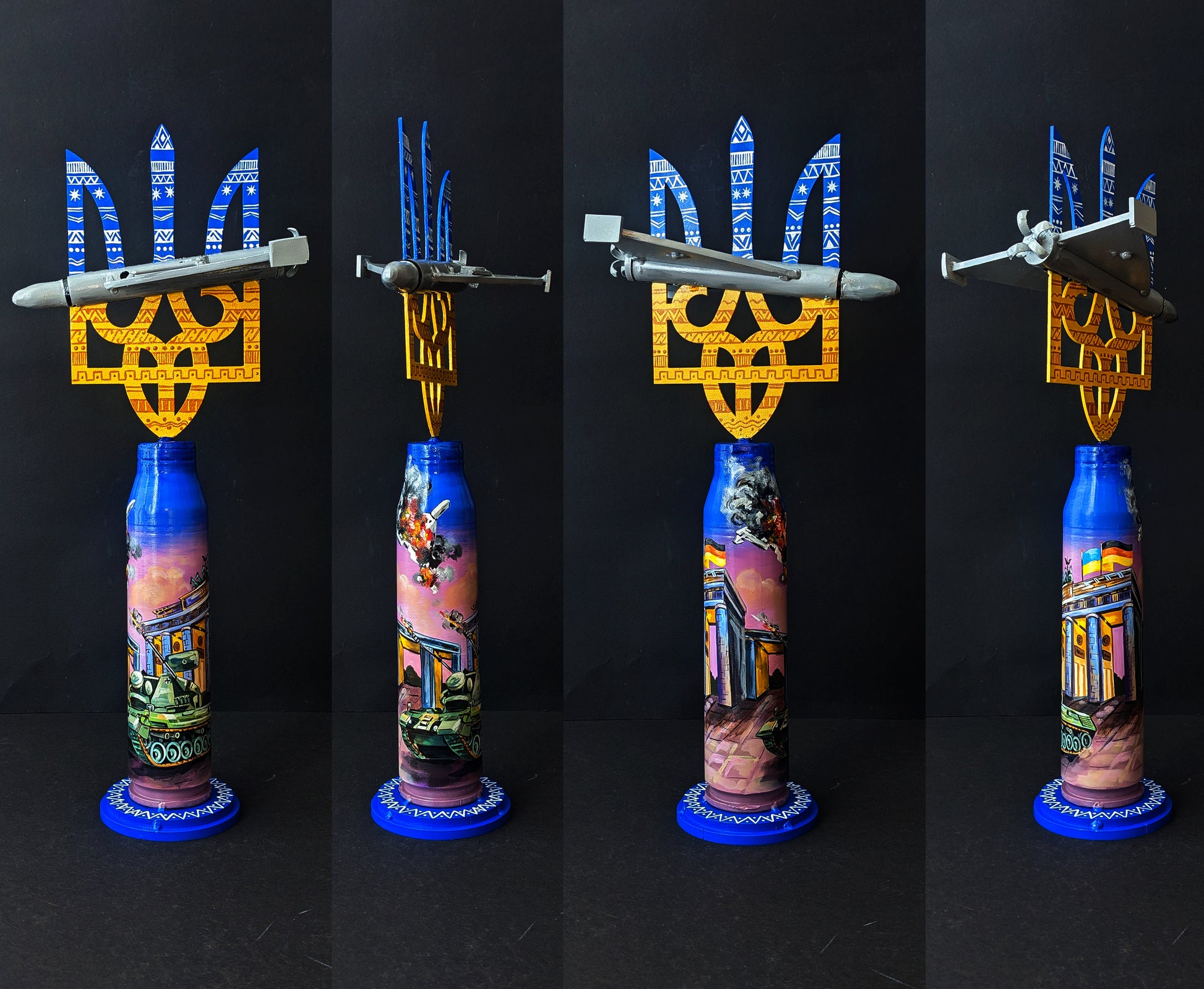Shaheed drone impaled on Tryzub. 43x18.5x19cm (HxLxW) Base is a Gepard shell fired in Kyiv.