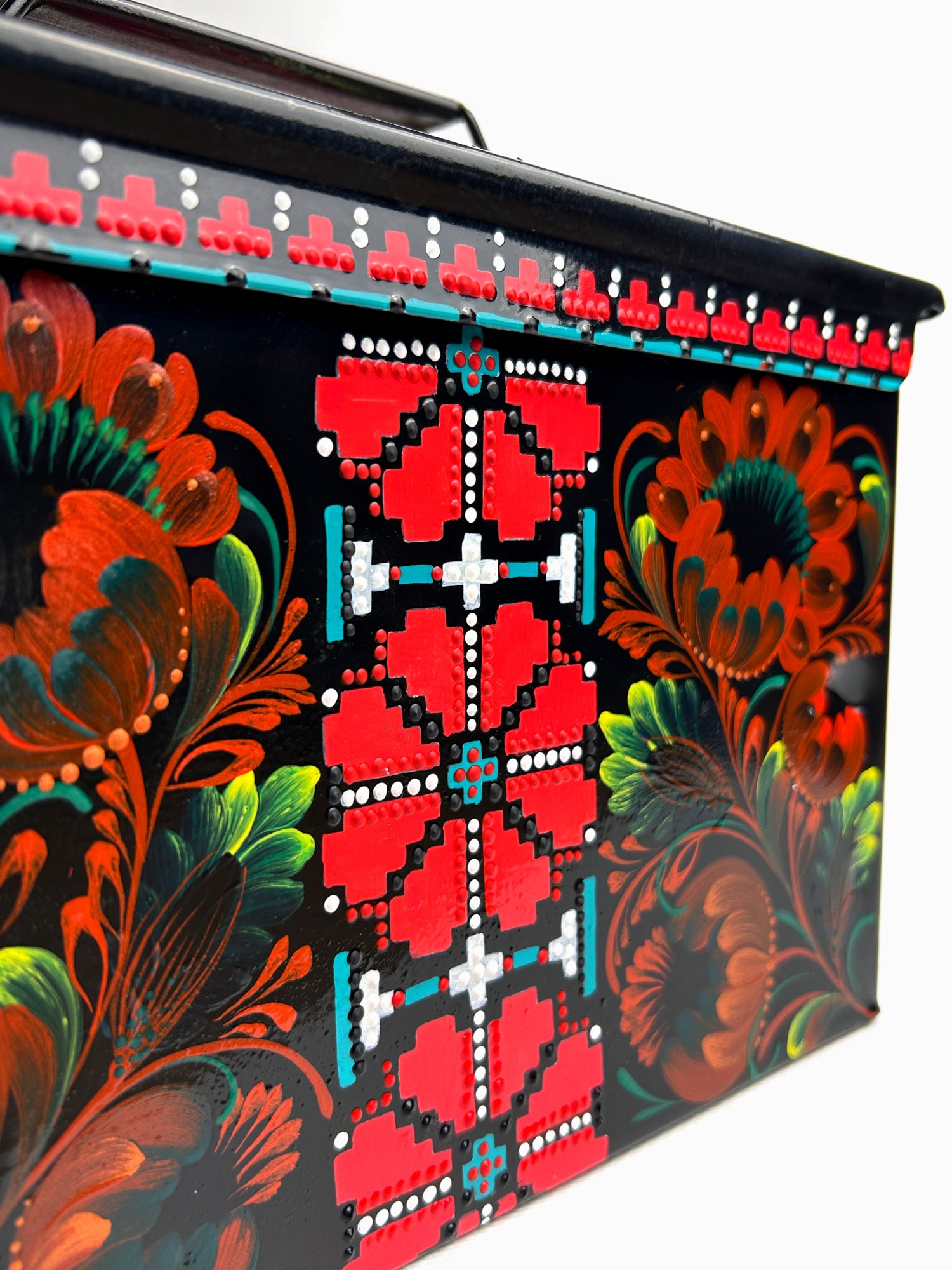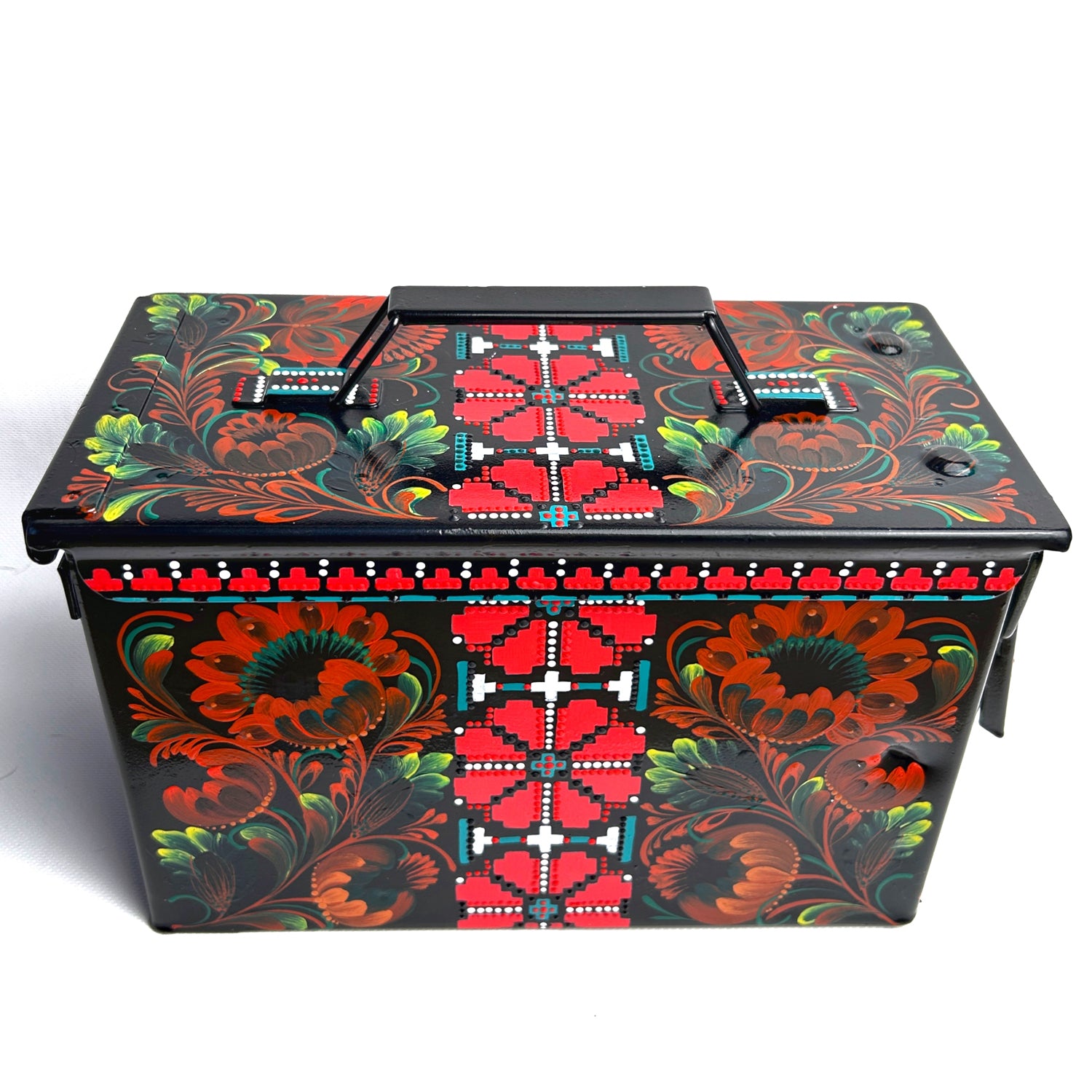 Metal ammunition box. Petrykivka painting. Created by Anastasia Leonova. You can follow her on https://www.instagram.com/lleonovana.ph/
