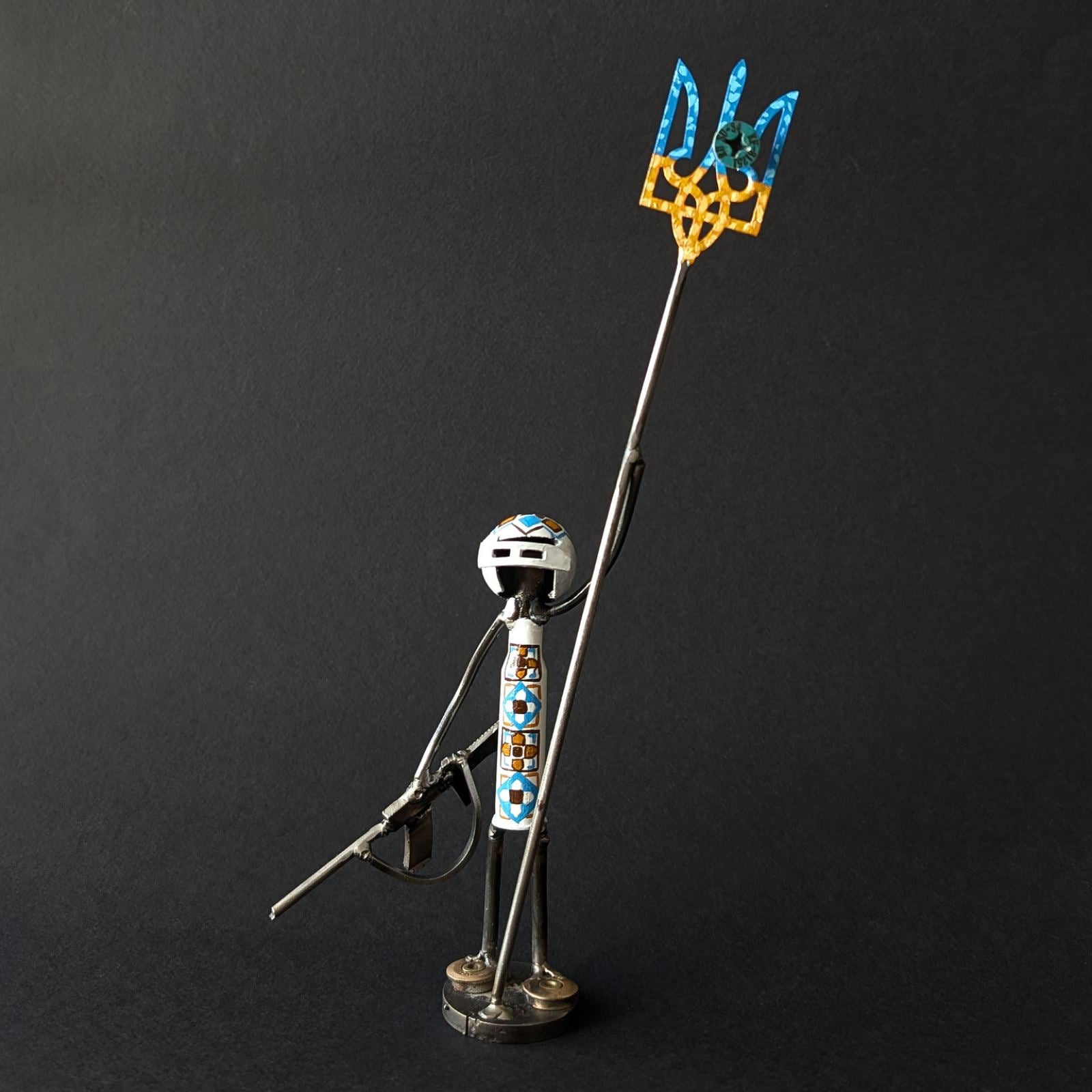 Mini-Soldier holding Tryzub with impaled screw from shot-down SU-34. (17cm tall). Painted by Catherine Ruban: instagram.com/troshki.schastya/