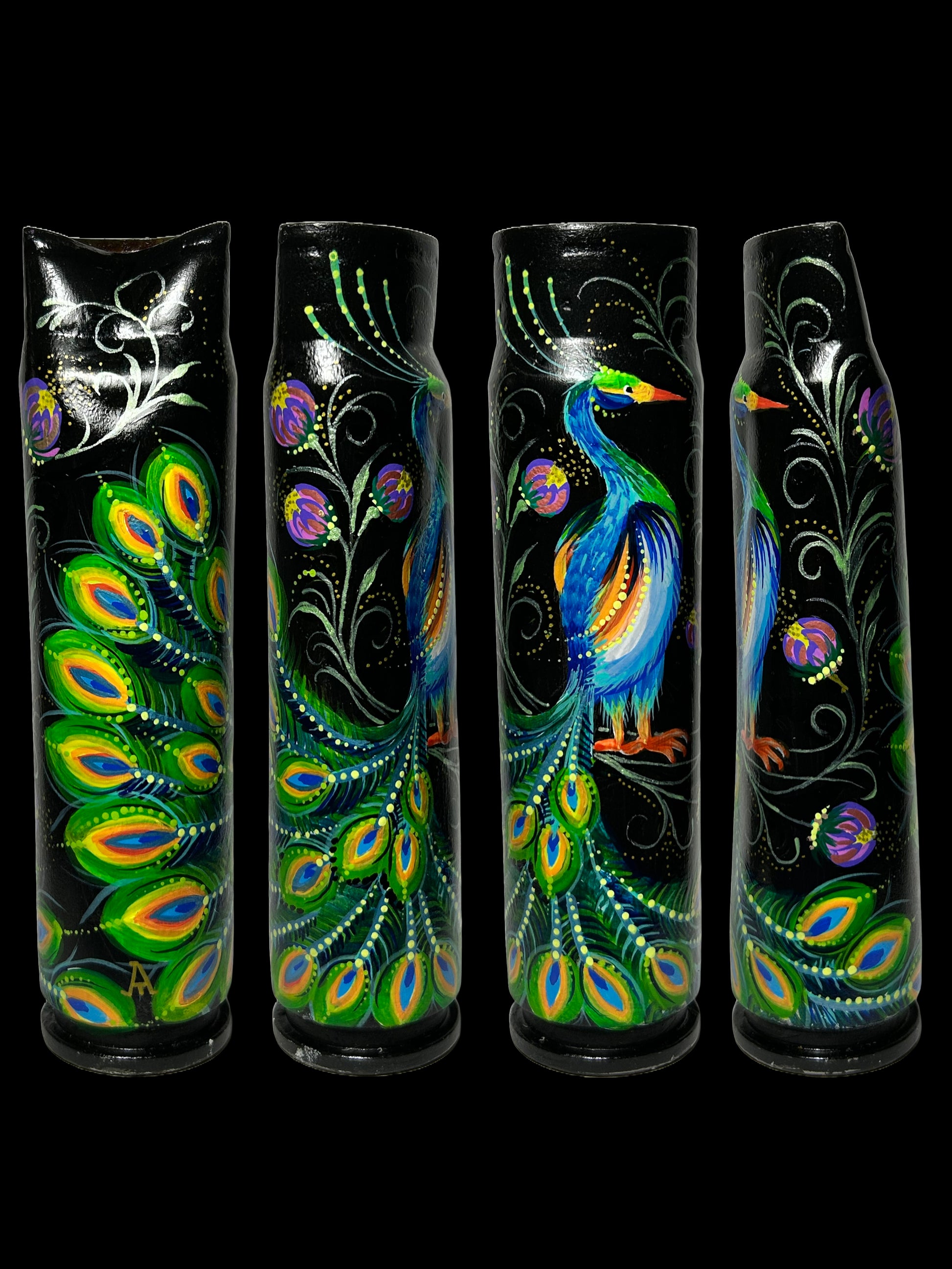 Ukraynalı sanatçı Tanya Leonova tarafından 30mm patlamış mermi kabuğu üzerine boyanmış tavus kuşu (16.5cm boyunda). Onu instagram.com/leonova.art.for.peace/ adresinden takip edebilirsiniz.