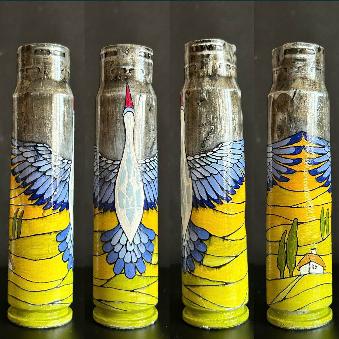 Toprağı ve Ukraynalı halkı kanatları altında saklayan ve koruyan Ukraynalı kuş. Üzerine boyanmıştır Ukraynalı sanatçı Tanya Leonova tarafından yapılmış 30mm boş kovan (16.5cm boyunda). Onu instagram.com/leonova.art.for.peace/ adresinden takip edebilirsiniz.