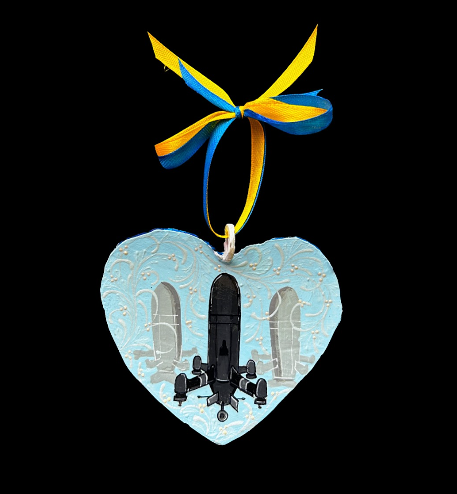 Прикраса у вигляді українського перехоплювача-дрона, виготовлена з 122-мм ракети Град. (1321 AL)