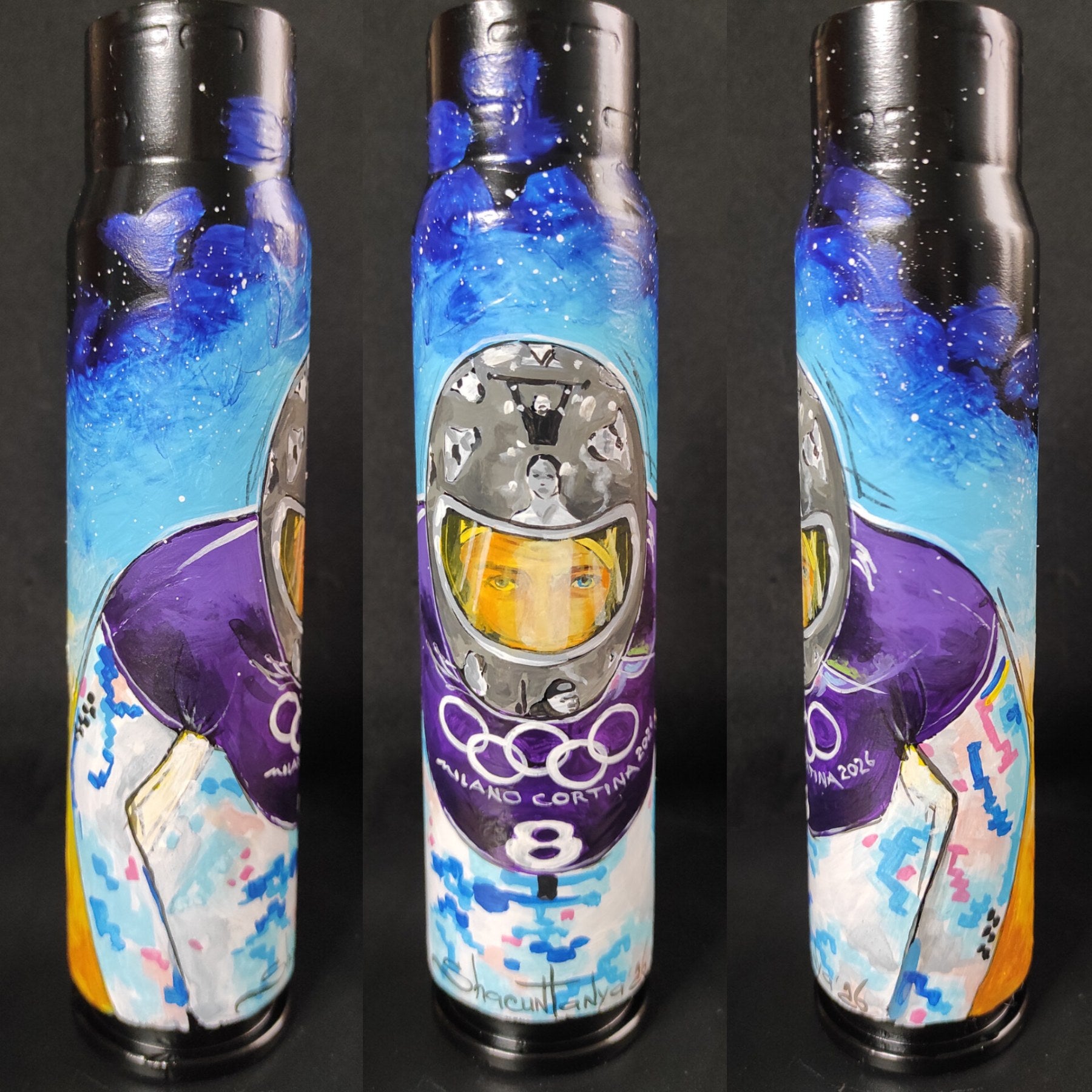 乌克兰运动员弗拉迪斯拉夫·赫拉斯凯维奇在乌克兰艺术家塔尼娅·沙昆创作的30毫米爆炸弹壳(高16.5厘米)上绘画。您可以在 instagram.com/tanya_shacun/ 关注她。